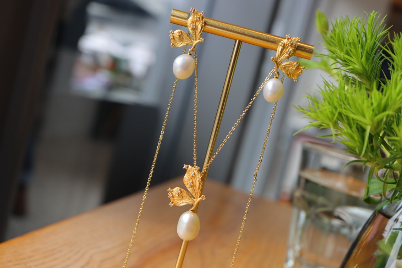 Baroque Butterfly Shape Gold Planted Sterling Silver Earings with Pearl