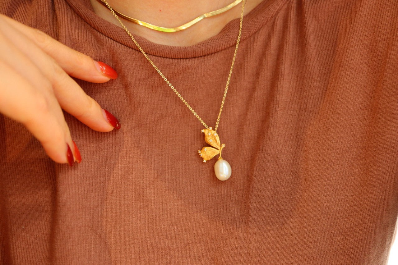 A very beautifully designed pendant, in the shape of a golden butterfly and a pearl attach to its tail. It is made from 925 silver with gold coating. This wonderful necklace make a perfect gift for a loved one for any occasion, such as Valentine's day, wedding, mothers day