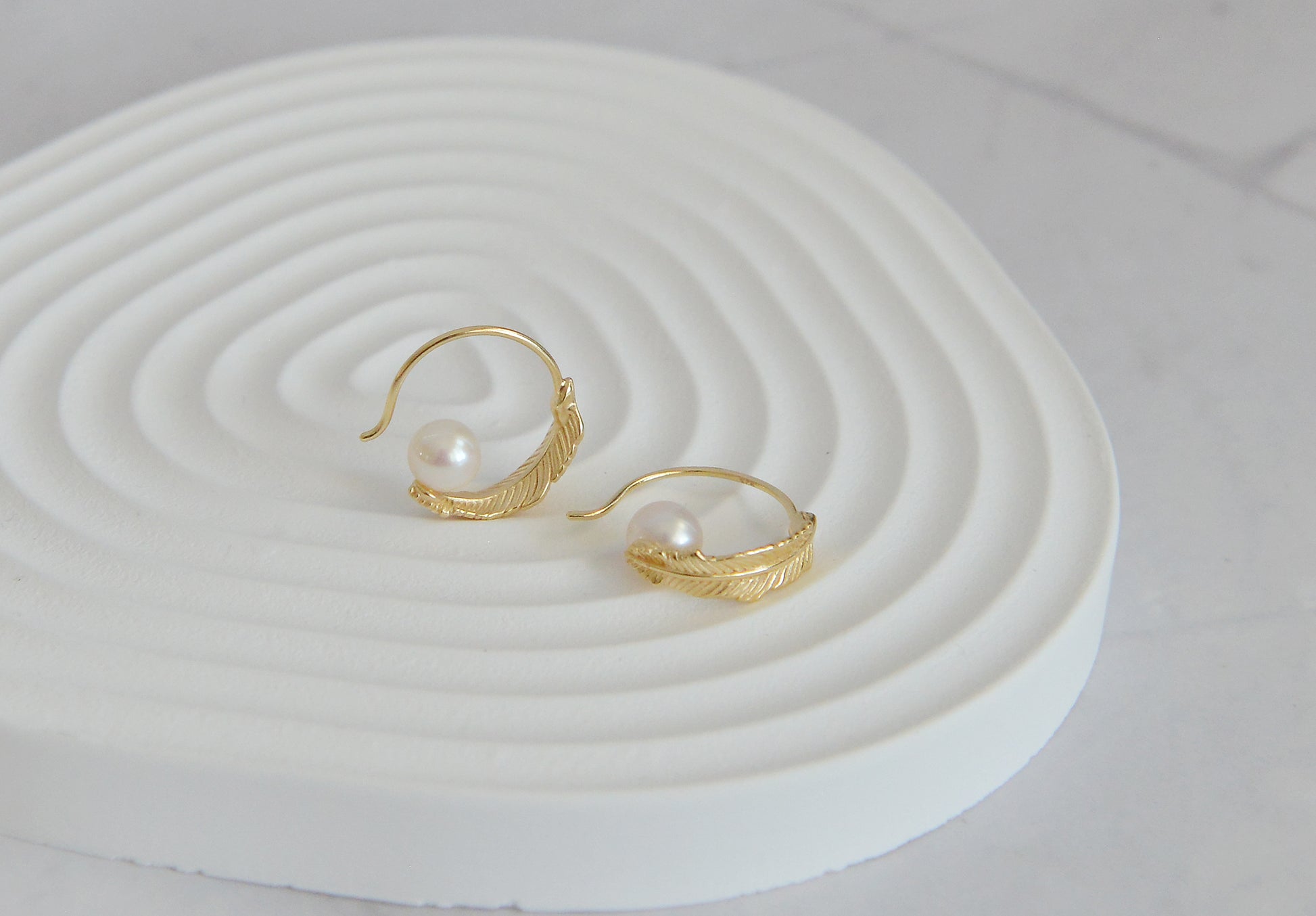 Genuine Pearl Earrings/Dainty Natural Pearls Earrings/White Pearl Earrings/gold feather hoop earring/