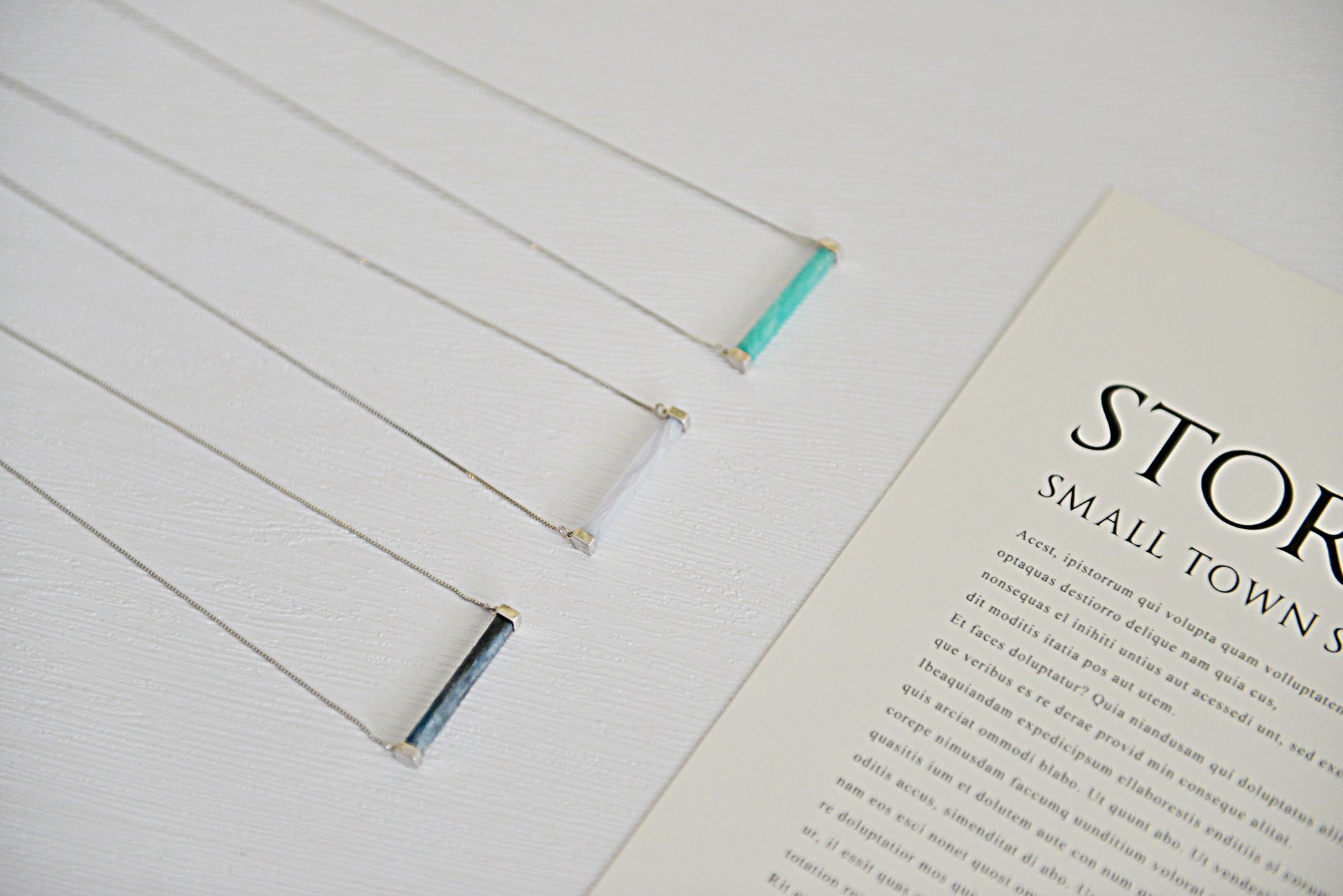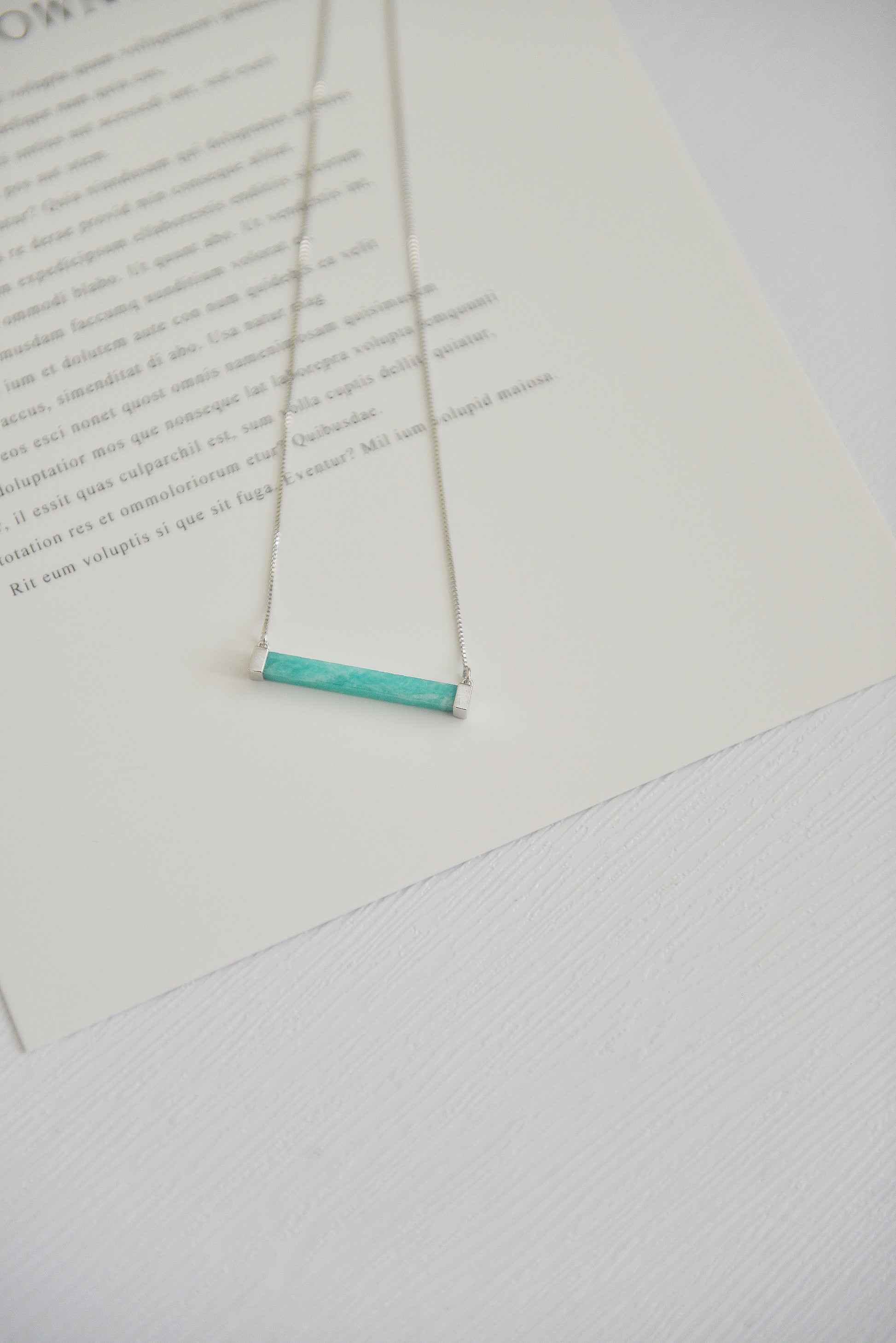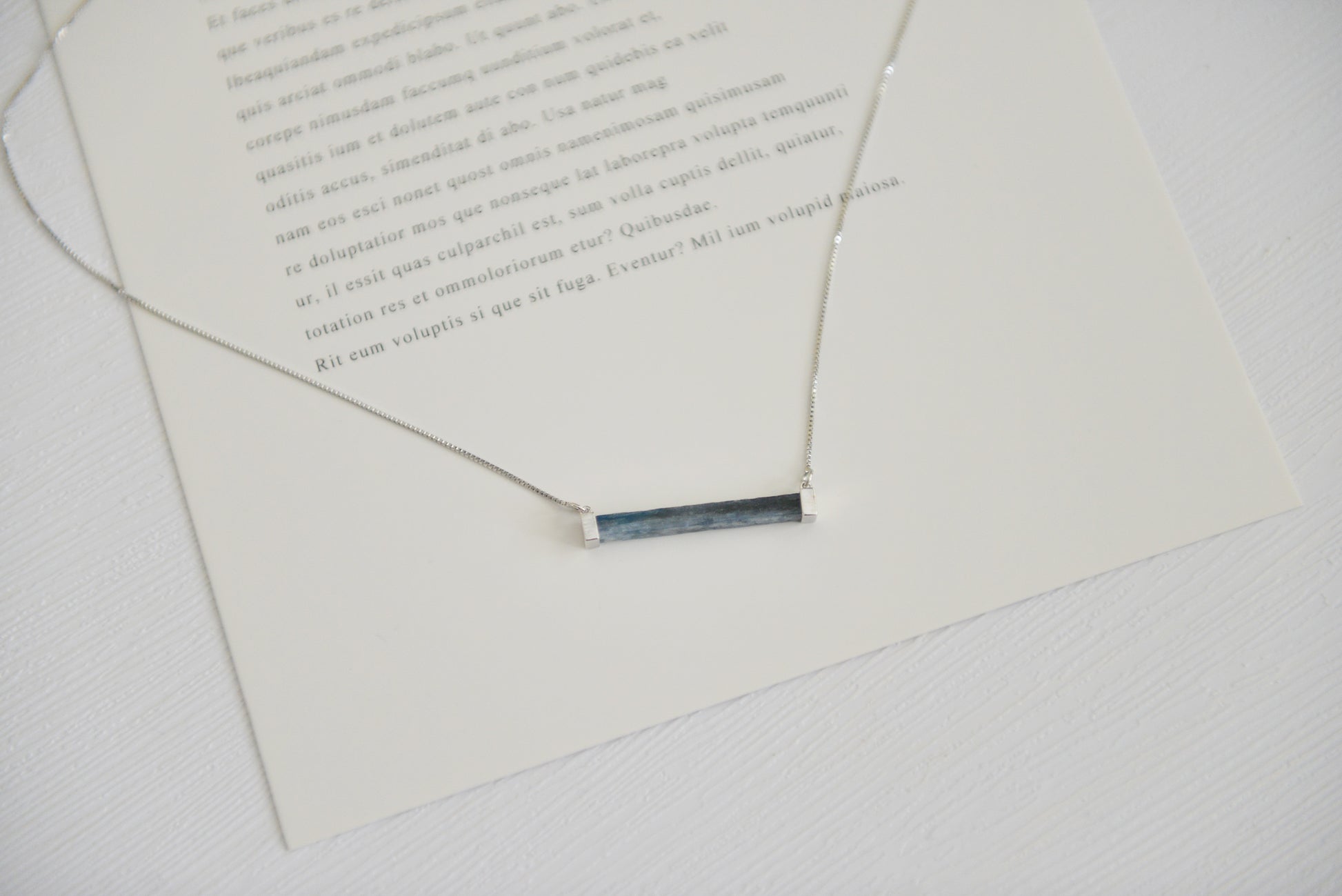 This is the ultimate minimalist necklace that can be worn with any style of clothing. The metal parts are all made of sterling silver, and natural stones of different materials are cut into long strips and set in sterling silver at both ends.