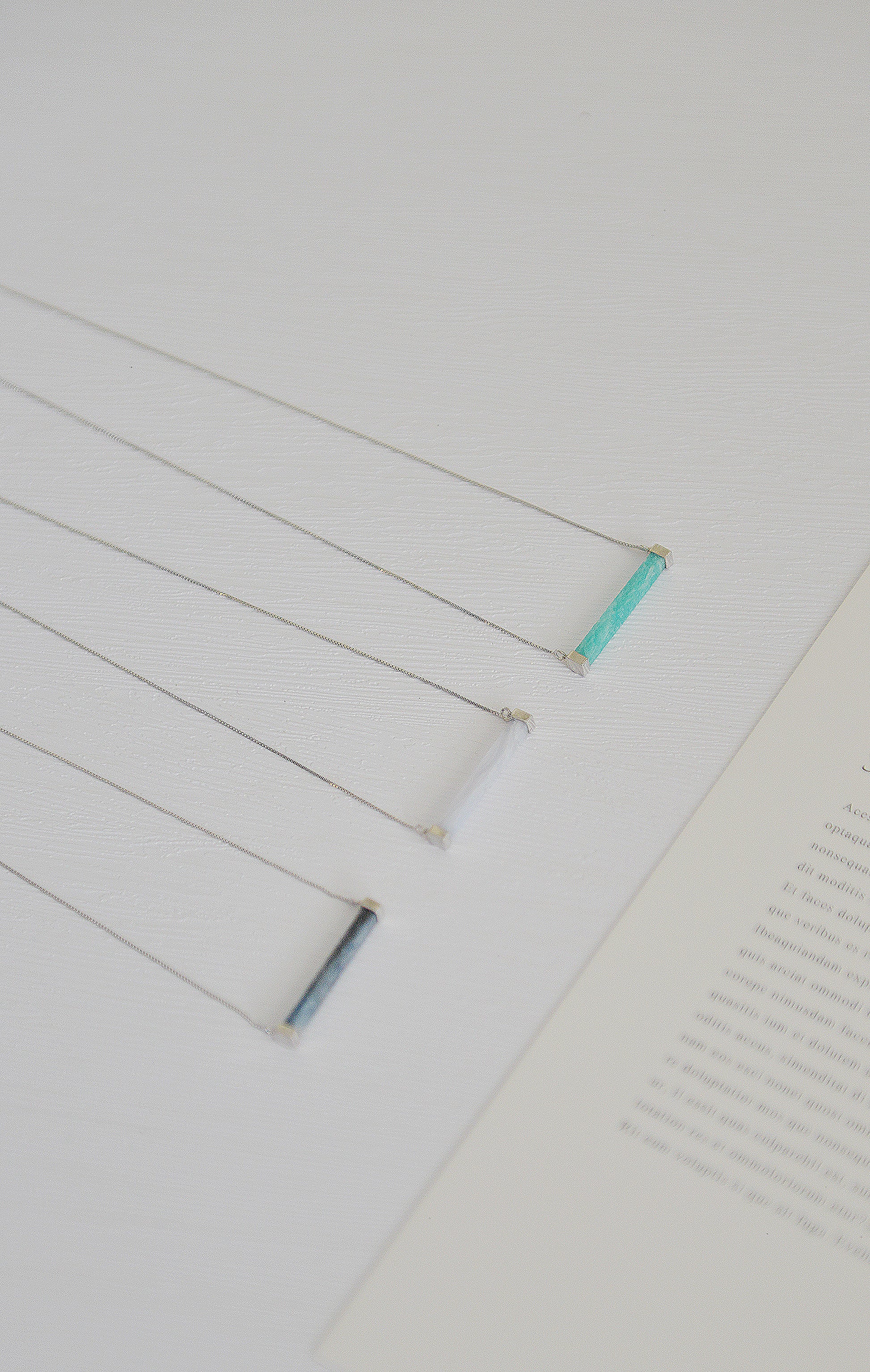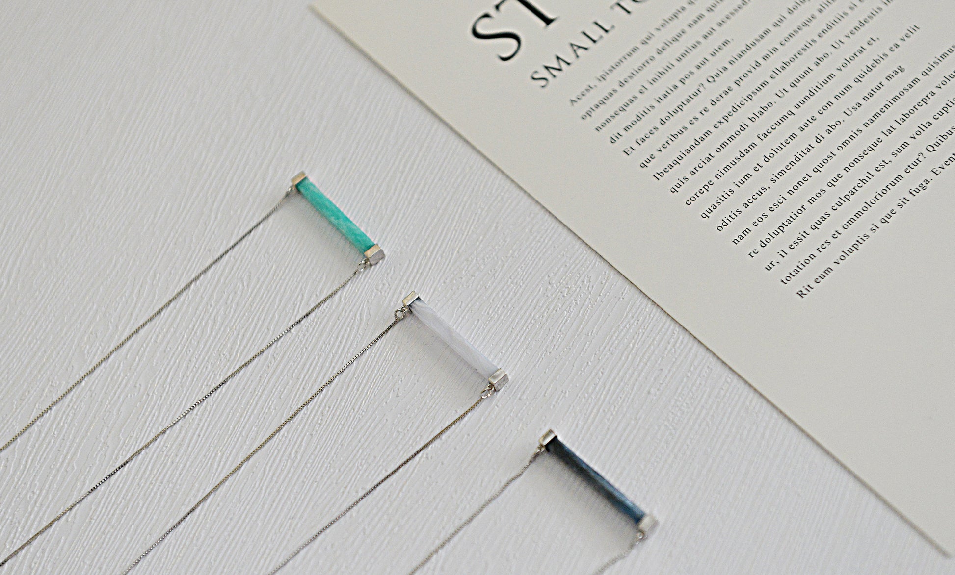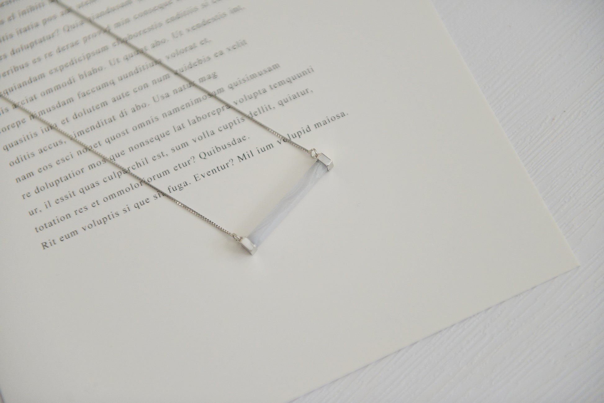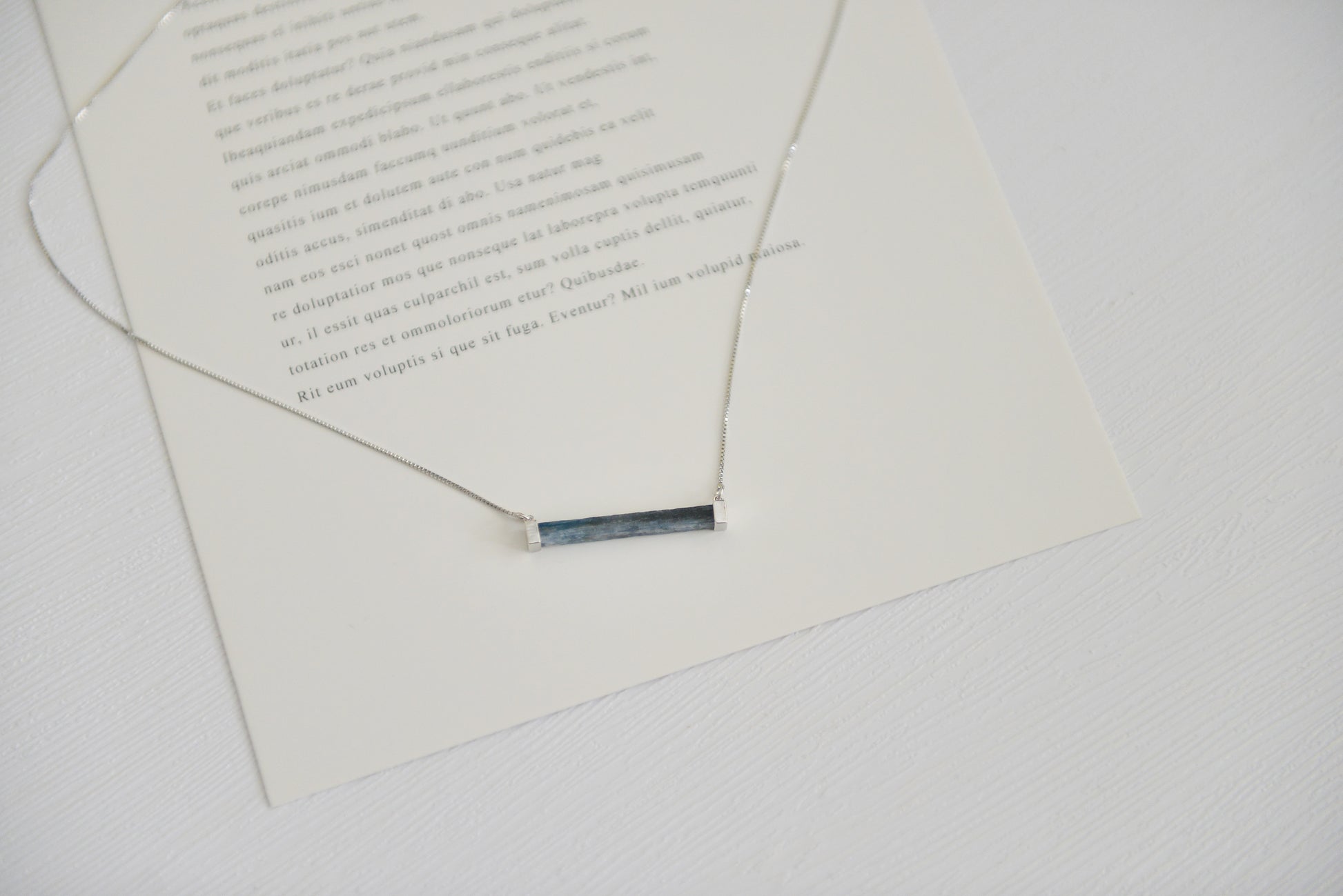 This is the ultimate minimalist necklace that can be worn with any style of clothing. The metal parts are all made of sterling silver, and natural stones of different materials are cut into long strips and set in sterling silver at both ends.