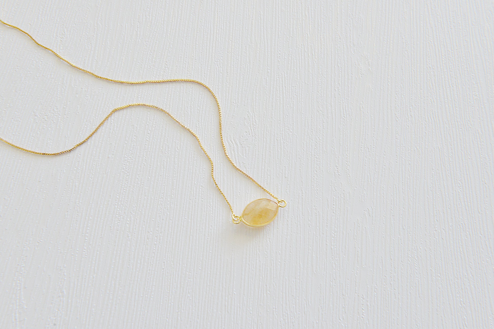 This necklace made by citrine and lapis lazuli. These semi-precious stones are cut in the shape of a rugby ball/ olive-shape, and the metal cladding process allows the brilliance of the stones to appear in their truest form.
