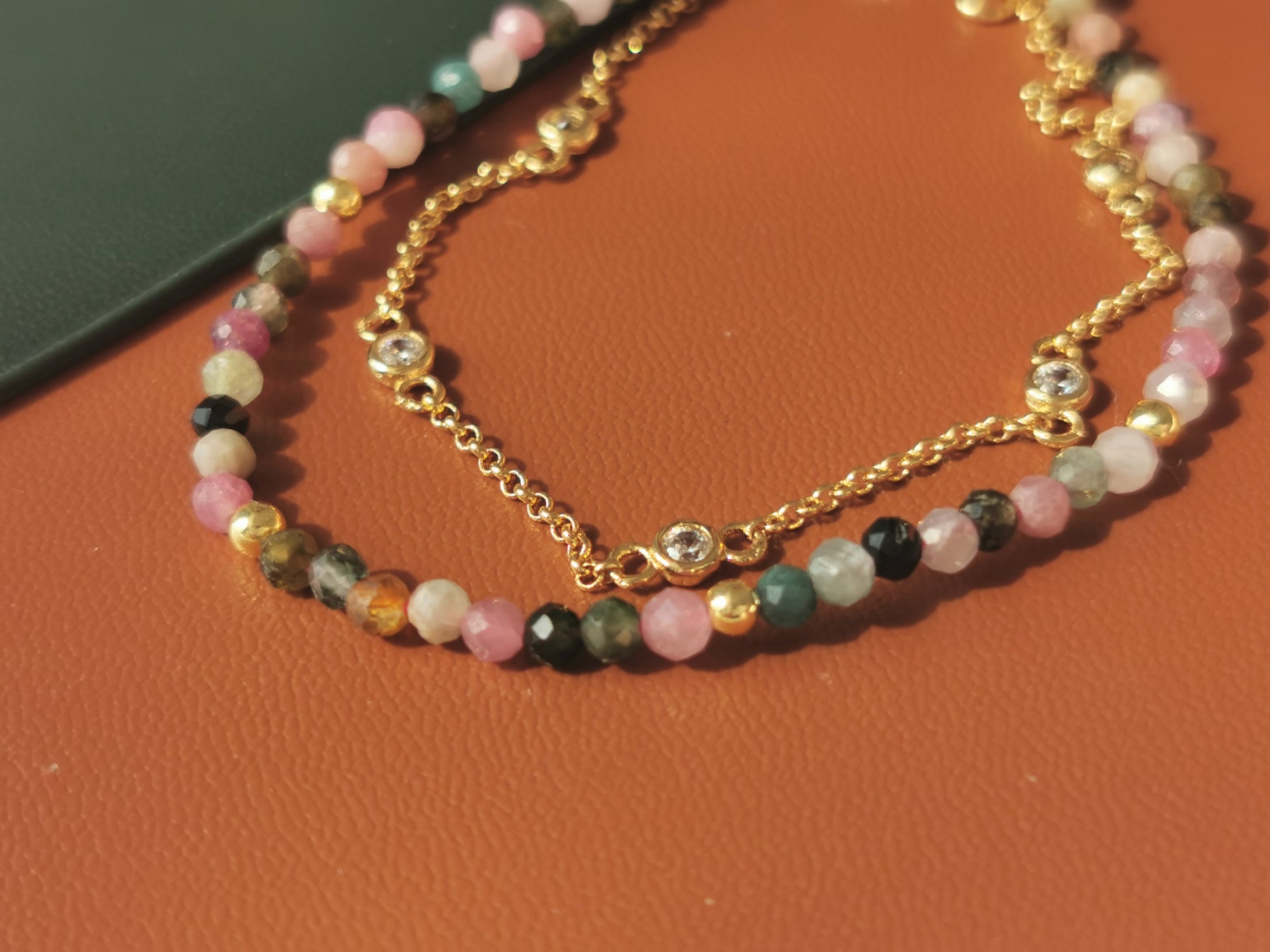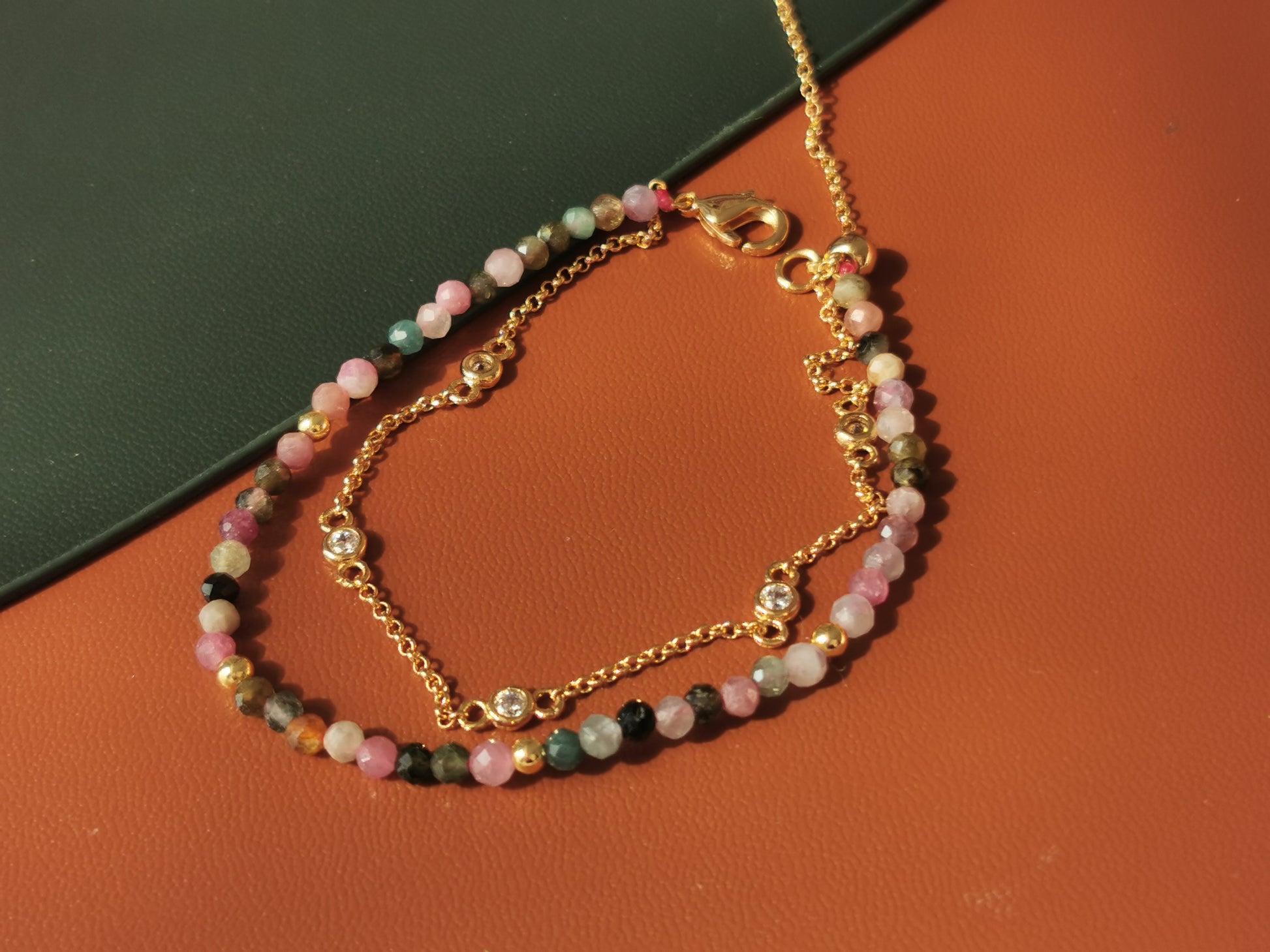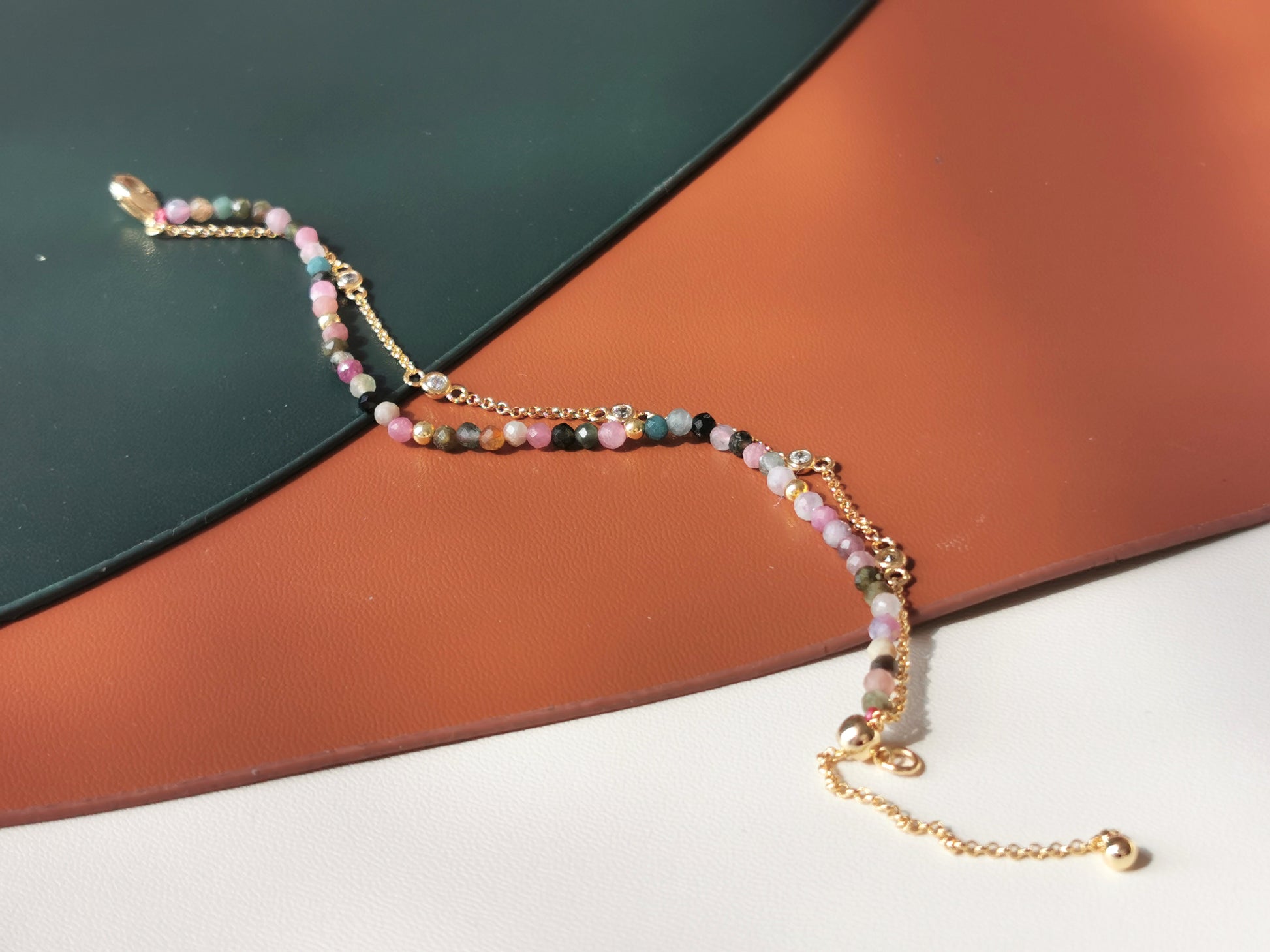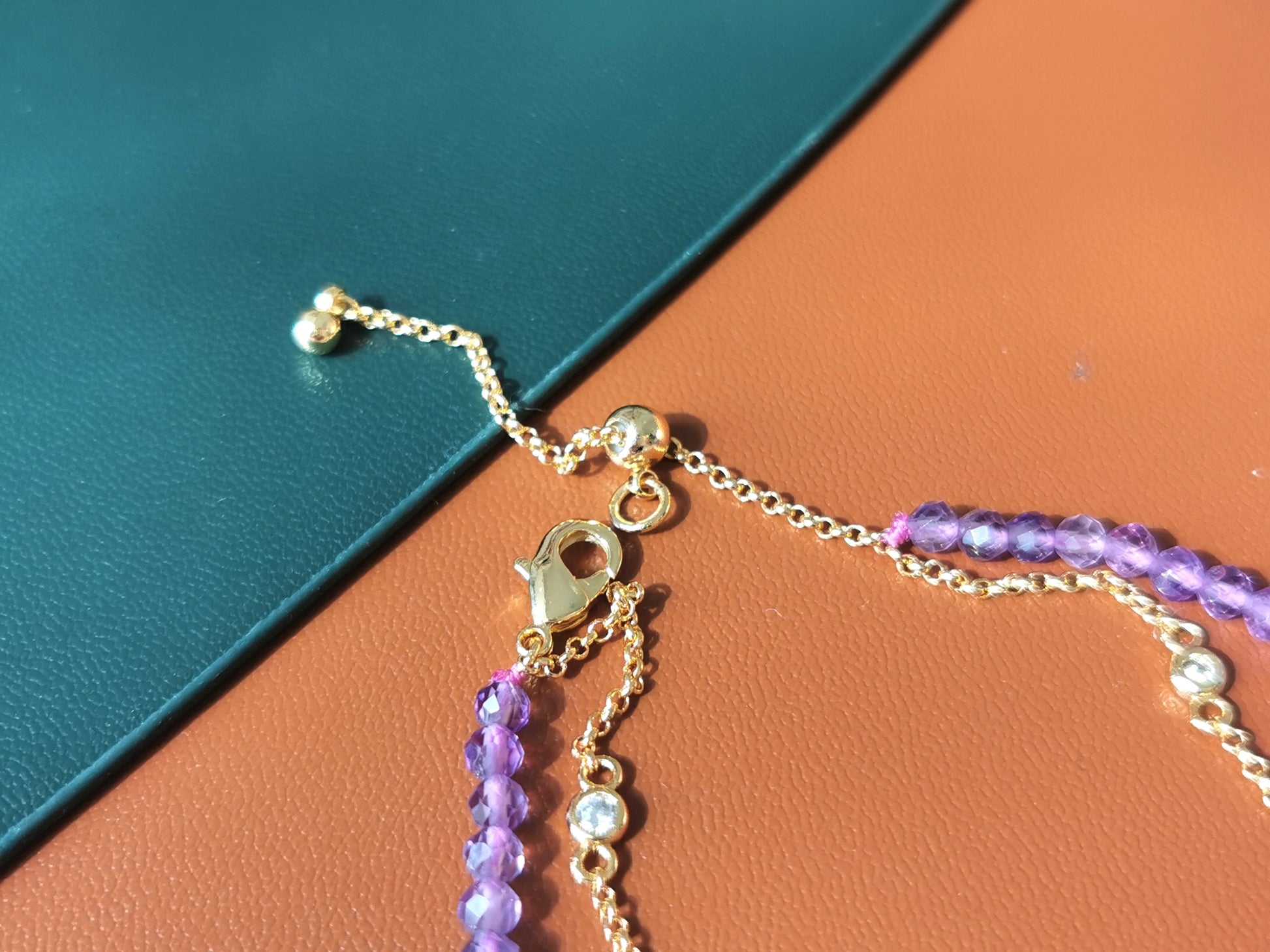 This bracelet made by three different gemstone: Peridot , Amethyst and Tourmaline.