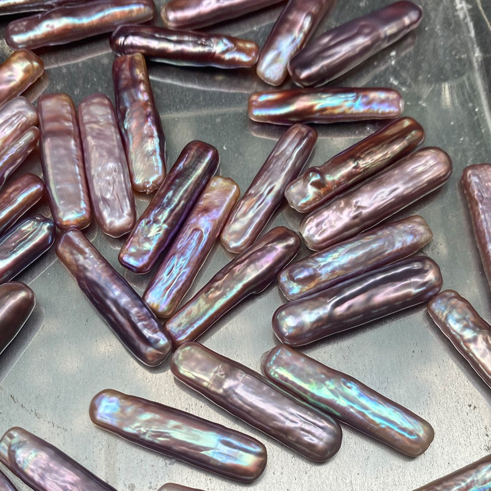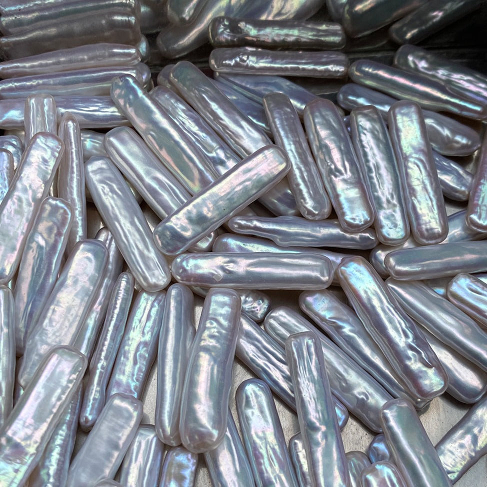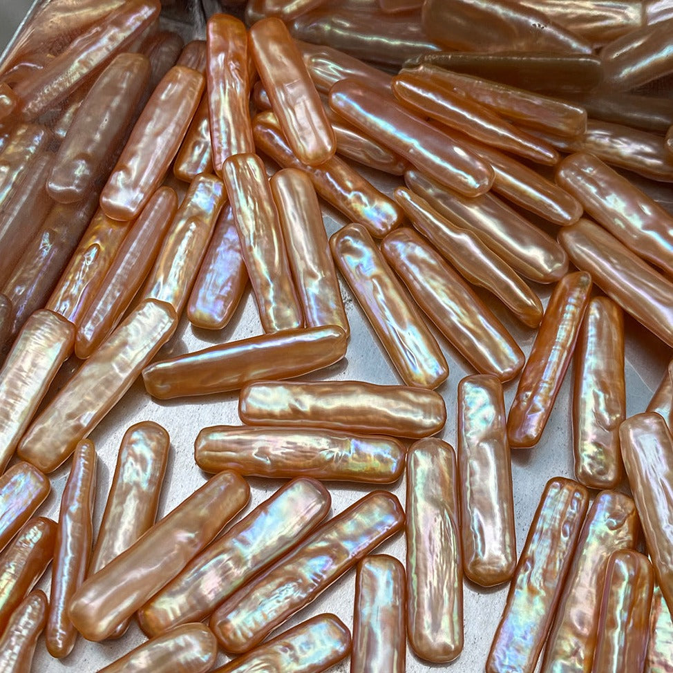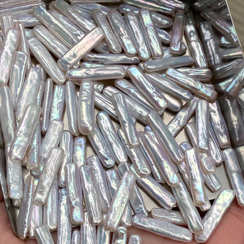 The rectangle pearl is a type of baroque pearl, which is a nucleated pearl. This kind of pearls are usually formed when a pearl farmer implants a nucleus into a pearl mussel shell and cultures it for 3-5 years.