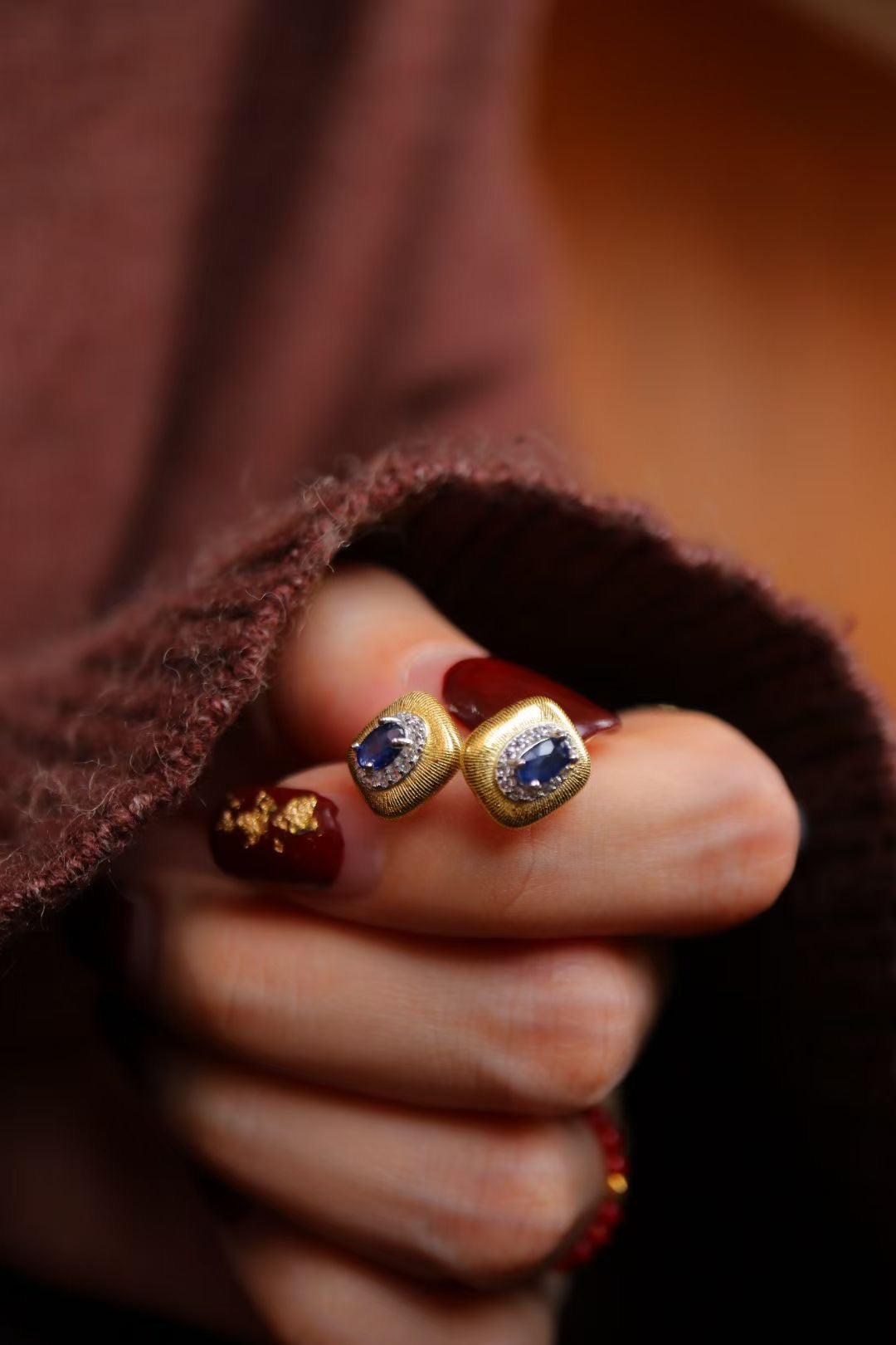 Vintage natural sapphire stud earrings / openwork carved texture earrings